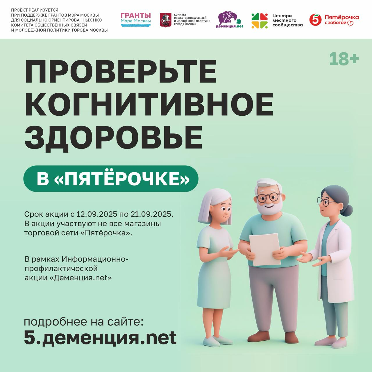 С 12 по 21 сентября 2025 года в московских магазинах «Пятёрочка» пройдет масштабная социальная акция по бесплатной проверке когнитивного здоровья, организованная совместно с проектом «Центры местного сообщества» (ЦМС). Акция приурочена ко Всемирному дню борьбы с болезнью Альцгеймера, принять участие в ней сможет любой желающий.